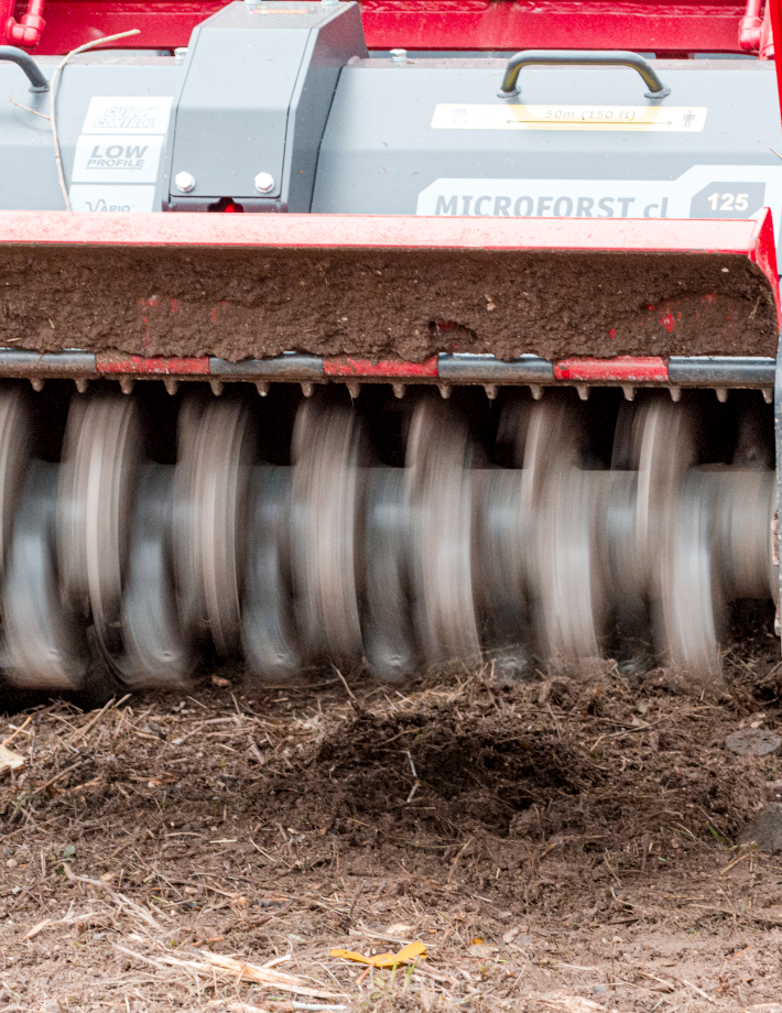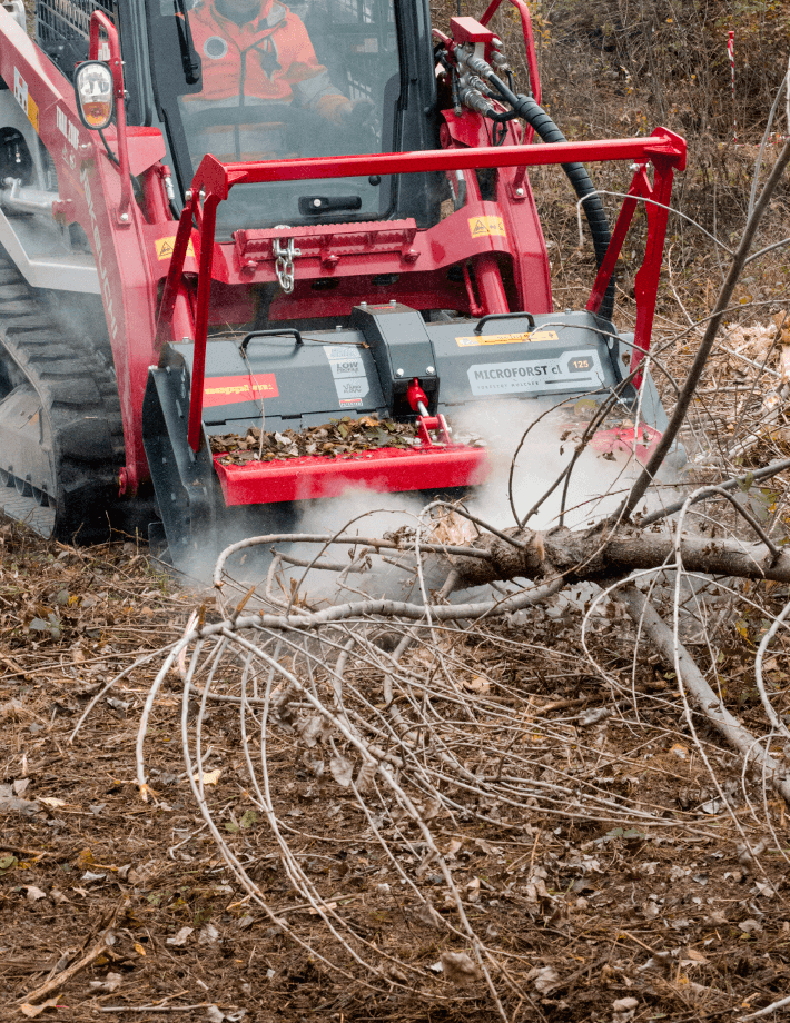 MICROFORST cl — это универсальный измельчитель для компактных погрузчиков (рекомендуемый расход 50–100 л/мин), идеально подходящий для узких, крутых или болотистых участков. С помощью лесохозяйственных инструментов он измельчает древесину диаметром до 13 см, а также используется в ландшафтном дизайне и коммунальных работах. Ротор CUT CONTROL с молотками MINI DUO обеспечивает мелкое измельчение с высокой эффективностью. В качестве опции доступен ротор MINI BLADE для чистого резания древесины. Благодаря усиленным опорным полозьям и гидравлическому кожуху MICROFORST cl обеспечивает максимальную производительность на небольших площадях.