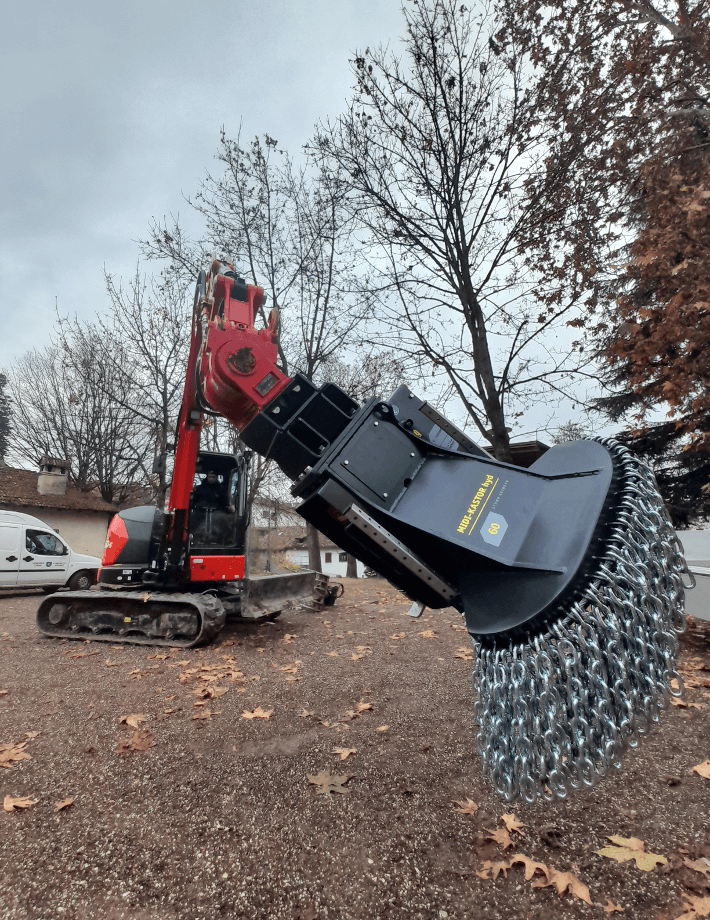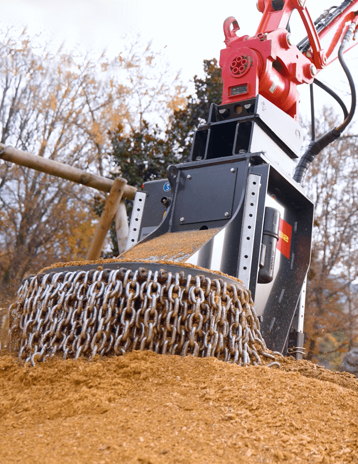 MIDI-KASTOR hyd — это мощная измельчительница пней для экскаваторов от 5 до 15 тонн. Благодаря роторному диску диаметром 60 см и инструментам HRC с вставками из карбида вольфрама она чрезвычайно эффективна и долговечна. Гидравлический поворотный механизм позволяет удалять пни любого размера и обрабатывать пни деревьев на глубину до 30 см. Мощный привод работает в диапазоне расхода 50-140 л/мин, с возможностью выбора различных двигателей.