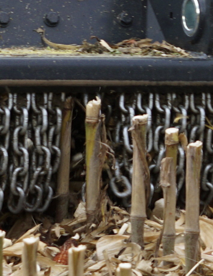 - Измельчение пожнивных остатков (например, кукурузной стерни, стеблей подсолнечника, остатков рапса)